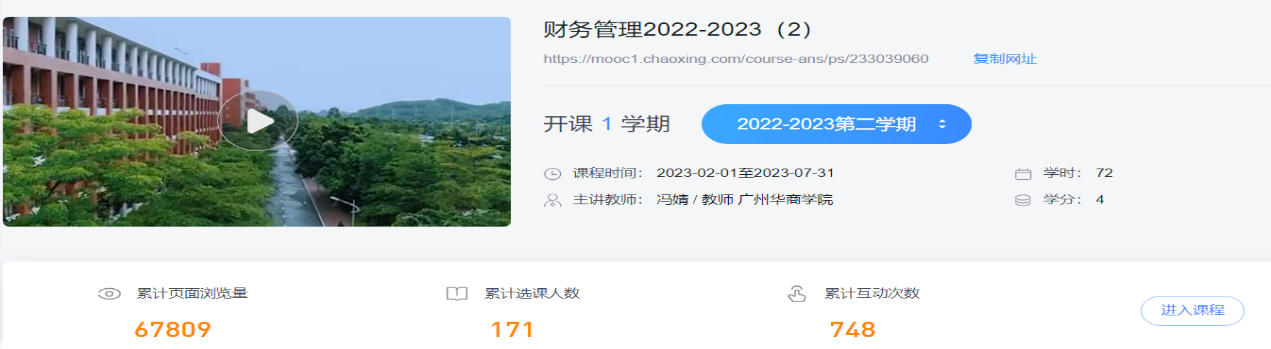 姚永红老师分析了本学期学习通的相关数据,本学期累计页面浏览量67 809次,选课人数171人,互动次数748次。《财务管理》作为一流课程,目前处于维护期,后续主要是不断更新完善相关资