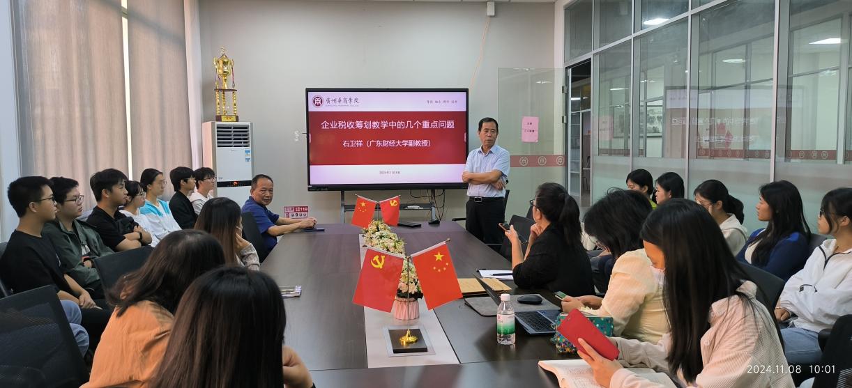 石教授的讲座深入浅出,不仅提供了税收筹划的理论框架,还分享了实际操作中的技巧和注意事项,使与会师生对企业税收筹划有了更深入的理解。讲座内容结束后,部分参会教师与石教授就税收优惠政策的适用、小微企业的税务筹划等话题展开了交流。