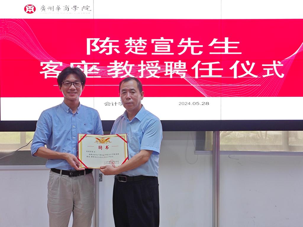 姚凤民院长热烈欢迎陈楚宣教授的到来,并为陈楚宣教授颁发了客座教授聘书。姚院长还表示期待陈楚宣教授后续能为我院师生带来更多前沿的会计实务讲座。
