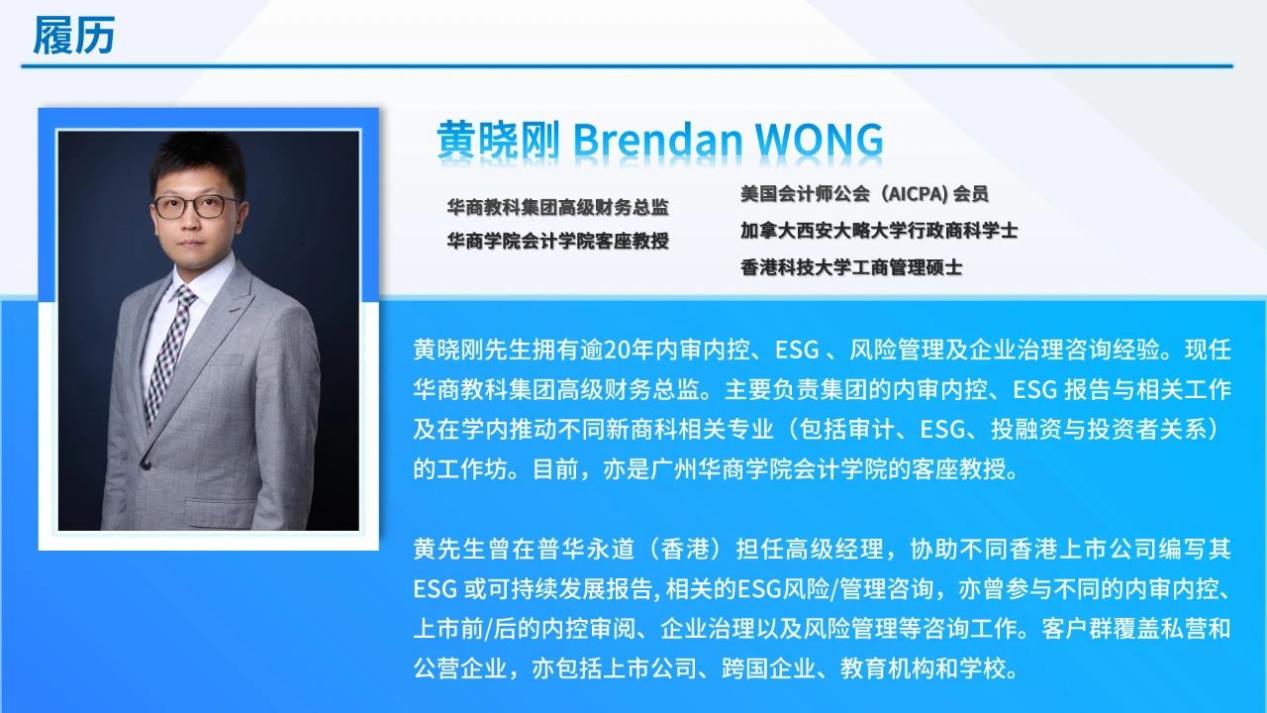 带着这些思考,安华理达非常荣幸邀请伟德国际victor1946“IR及信用管理工作坊”的项目带头人黄晓刚老师 Brendan,为大家揭秘合作背后的故事,共同探索校企融合下IR及信用管理人才培养的新模式!Brendan老师在内审内控、ESG、风险管理及企业治理咨询领域拥有逾20年经验,现任华商教科集团高级财务总监,亦是bv伟德国际1946客座教授,曾助力多家香港上市公司开展风控、ESG等相关工作。