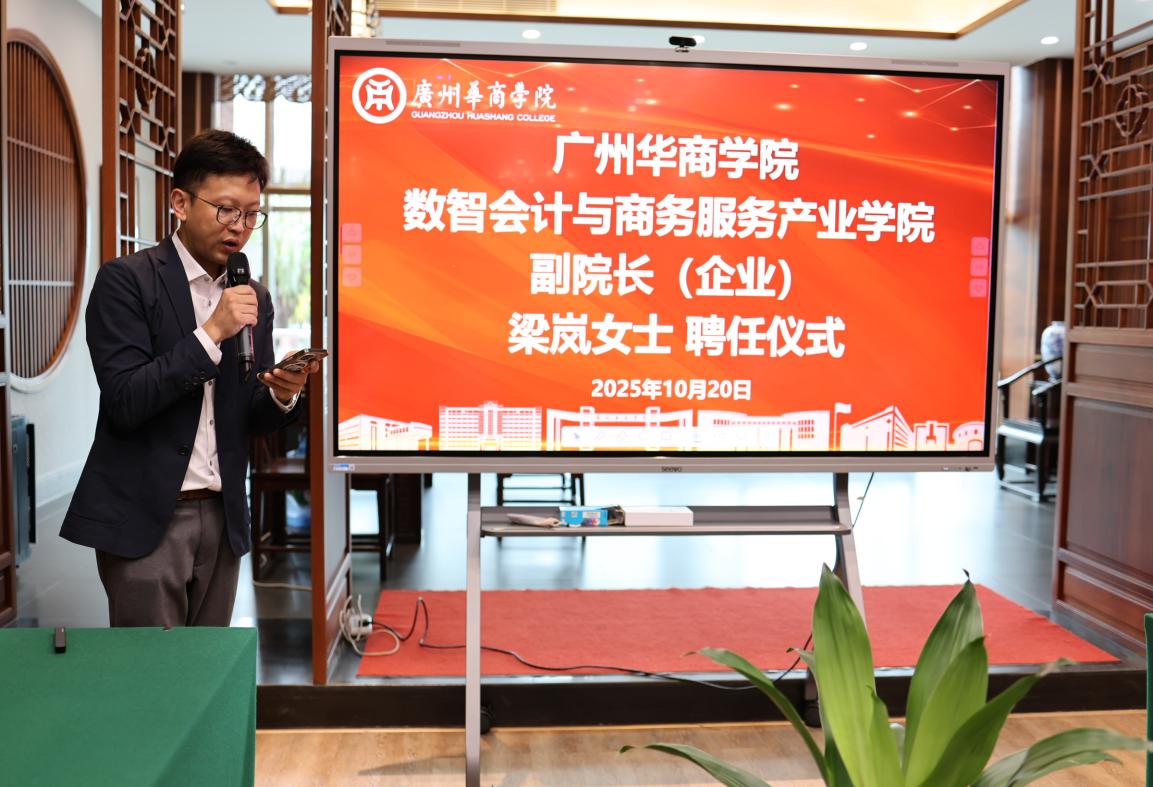 华商科教集团副总裁兼数智会计与商务服务产业学院联席院长廖旭东先生致辞。他高度评价梁岚女士的行业资历——拥有30余年企业管理与风险管控经验,曾担任普华永道中国及香港地区多项高层职务,深耕治理风控与合规服务领域,兼具国际化视野与实践洞察力。廖旭东表示,梁岚女士的加入将为产业学院注入强劲动力,推动产教融合向更高层次迈进。