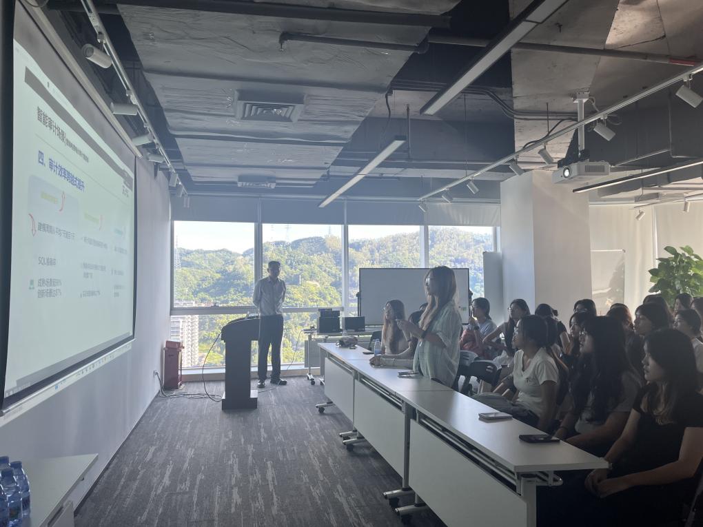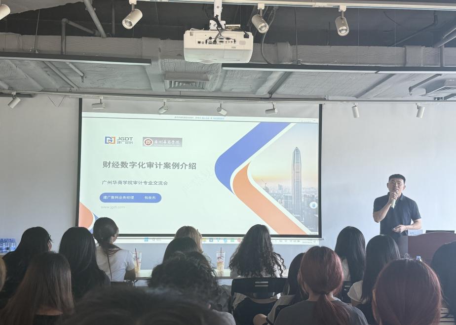 随后,建广数科多位业务骨干带来三场干货满满的主题分享,为同学们打开了数字化审计的实践窗口。首先大客户服务部负责人黄仲以《建广数科中国领先的产业数字化转型赋能者》为题,解析了企业在数字化转型领域的核心技术与全链条服务能力,结合服务制造、金融等行业的标杆案例,展示如何通过数字化工具破解企业运营痛点,让同学们对产业数字化转型的实际价值有了更深入的理解。